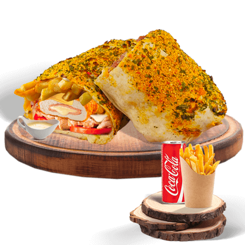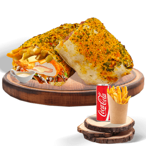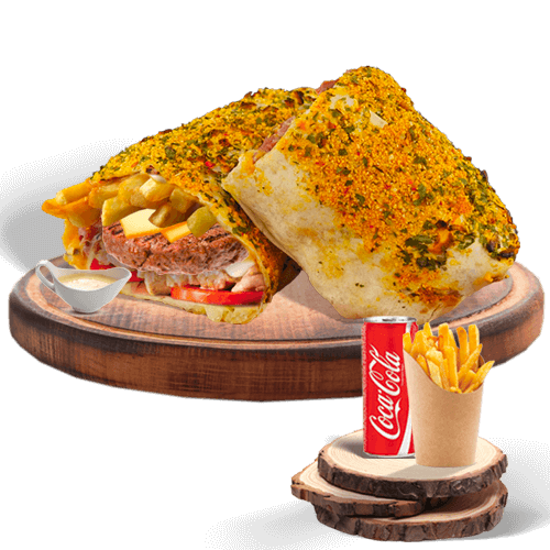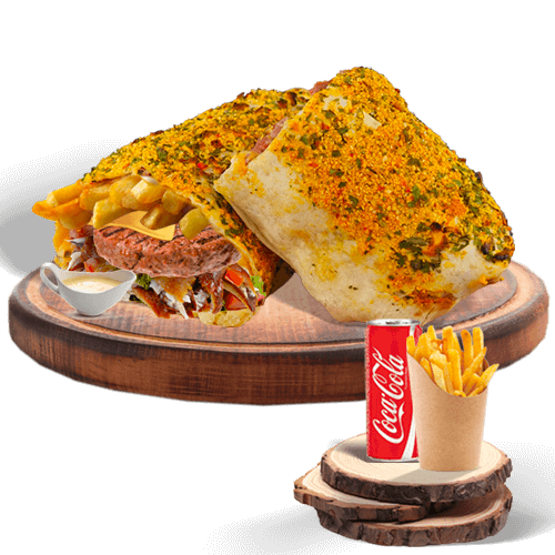 KEBAB, STEAK, MOZZA, CHEDDAR, FRITES, SAUCE AUX FINES HERBES, CHAPELURE, SAUCE GRUYERE,