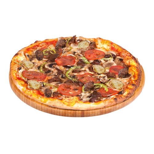 MERGUEZ, MOZZA, LAMELLE DE BOEUF, LARDON, SALADE, TOMATE CERISE, CHAMPI, POIVRONS, OLIVES,